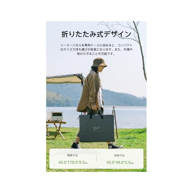 【折りたたみ式でコンパクト】広範囲のソーラーパネルが効率よく太陽光を集め、発電能力が非常に高いため、数日間のアウトドアや災害時の備えとして最適です。折りたたむことでコンパクトかつ軽量化が実現され、収納時にも場所を取らず便利です。展開寸法:42.0*178.5*2.5 cm。収納寸法:42.0*48.0*2.5 cm。