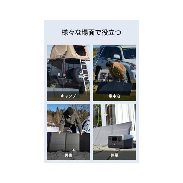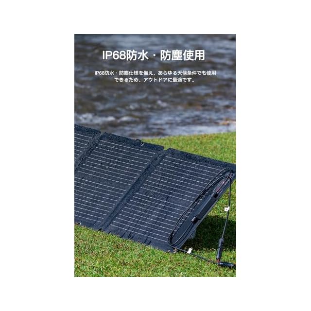 【IP68防水・防塵機能】ソーラーパネルとMC4端子にはIP68の防水・防塵機能が備わっており、防災グッズとしてはもちろん、車中泊、登山、釣り、キャンプ、テントなどのアウトドア活動にも十分に対応できます。また、収納バッグには撥水素材が使用されており、小雨程度の軽い水濡れであれば安心して使用できます。