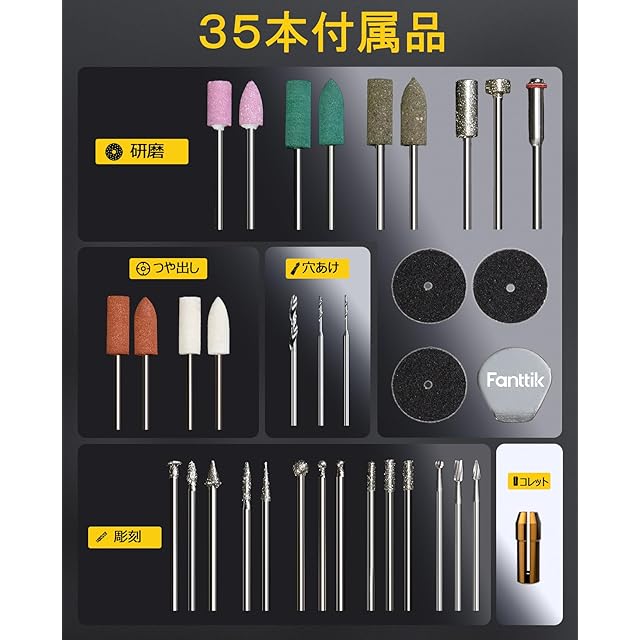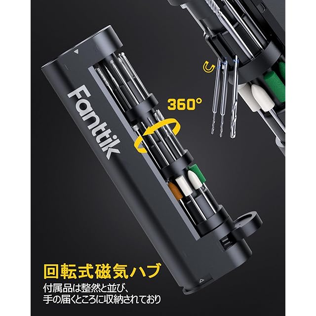 回転式マグネットハブ: もう乱雑なアタッチメントを探す必要はありません!ミニルーターF2 Master は360°回転できるマグネット式スタンドと整然と並んだ35個アクセサリー(3/32インチ/2.3 mm)を備えており、研磨、研削、穴あけ、彫刻などのDIY作業をもっと簡単にまた便利にします