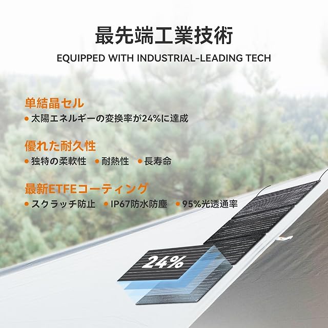 【23%から24%に進化高い転換効率折り畳み式太陽光発電】変換効率を向上させるため、PC4040ソーラーパネルはPL4040へと改良されました。PL4040ソーラーパネルは光透過率が高いETFE素材を採用しております。通常の樹脂製品よりも最高95%の光透過率を実現し、太陽光の転換率は業界トップクラスの24%に達しています。耐熱性だけなく、薄型で、最大60度まで曲げられ、落下や衝撃にも耐久性があります。IP67レベルの防水防塵機能を搭載し、通常の小雨や小雪でも安心してご使用いただけます。屋外での活用も安心です。太陽のエネルギーを直接電力に変換し、一切の燃料を使用せずに、100%グリーンエネルギーを実現します。*太陽光発電量を最大化し、安定した電力供給を実現する対策について、弊社アフターサポートから具体的にご案内いたしますので、是非はお気軽ご連絡ください。
