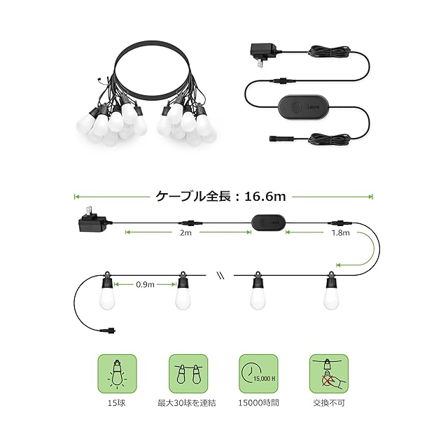 【商品仕様】ケーブル全長:16.6m │ LED電球数:15個(最大30球を接続) │ 電球形状:S14 │ 光色:電球色+RGB色 │ 全光束(明るさ):700lm │ 給電:DCアダプター │ 防水:ケーブルとライト部分はIP65防水仕様(アダプターは非防水仕様) │ パッケージ内容:ストリング16.6m15球*1、コントローラー*1、アダプター*1、説明書*1 │ 【ご注意】製品を利用するために、「Lepro」アプリでアカウント登録要(アプリ制御の製品で、リモコンは付属しておりません) │ ※接触不良を防ぐために、ケーブルの接続部分を正しく合わせてしっかり押し込み、きつく締めてください。