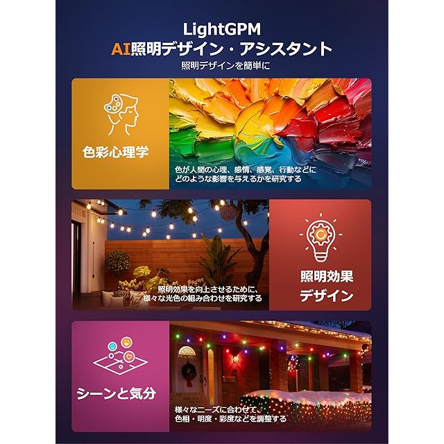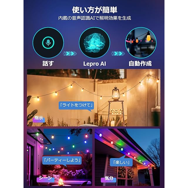 【使い方が簡単・内蔵の音声認識で照明効果を生成】アプリ「Lepro」には新開発の対話型生成AIが組み込まれており、音声コマンドでON/OFF、明るさや色、動的効果などの調整ができます。さらに、Lepro AIに話しかけることで、AIが何千兆もの照明効果と色の組み合わせから最適なものを提案します。例えば、「クリスマス/パーティー/リラックス」などの指示もAIによって最適な照明効果がデザインされます。進化したLeproスマートストリングライトは、特定の色や明るさを選んだり、ユニークな照明モードを設定したりすることで、完全にお客様の個性に合った照明環境を創り出すことができます。
