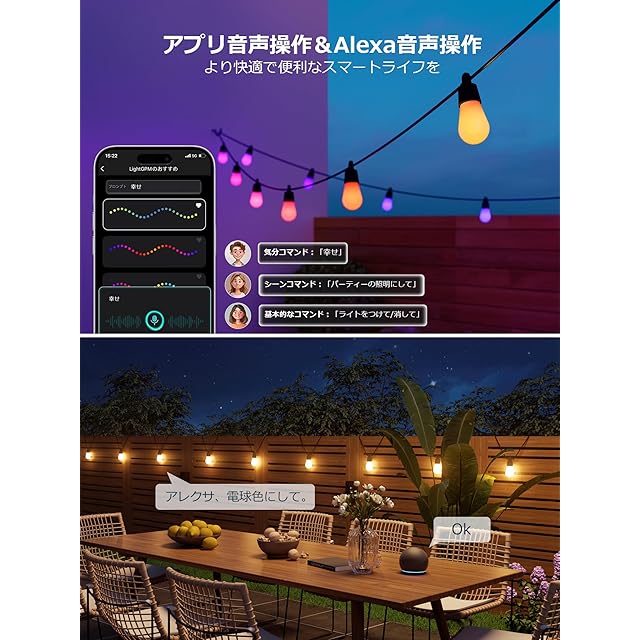 【電球色&RGB+APP調光調色・アレクサ音声対応】電球色とRGBカラー搭載で、アプリで操作できる様々な照明パターンもあり、お好みに合わせて雰囲気作りの照明として最適。アプリで無段階調光調色と自己生成できる豊かな点灯モードの切り替えもできます。雰囲気作りのキャンプ、ポーチ、デッキ、披露宴などのアウトドアにもAPPで遠隔操作ができて非常に便利です。さらに、AlexaやGoogleアシスタント音声コントロールにも対応。手が離せない時でも、声でON/OFFや調色/調光が可能です。