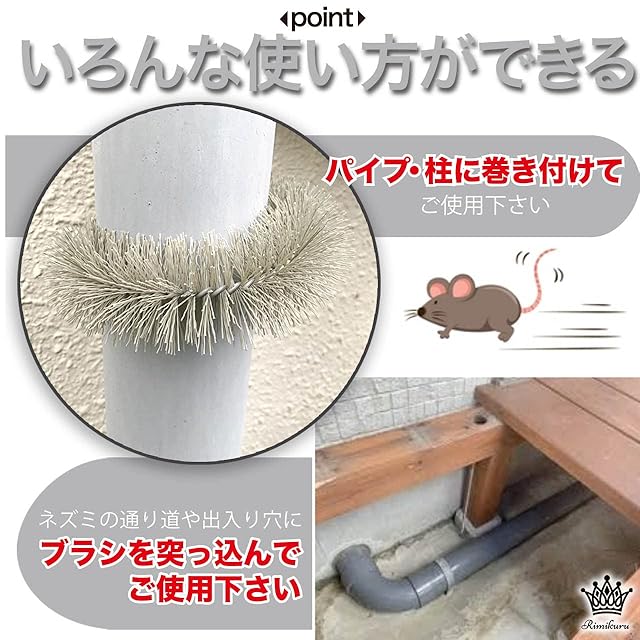 いろんな使い方ができる:ネズミの通り道や出入り穴にはブラシを突っ込んでご使用いただいたり、パイプや柱などに巻き付けてご使用いただくことができます。また、ネズミの多いところには二重巻きして使用しても効果的です。