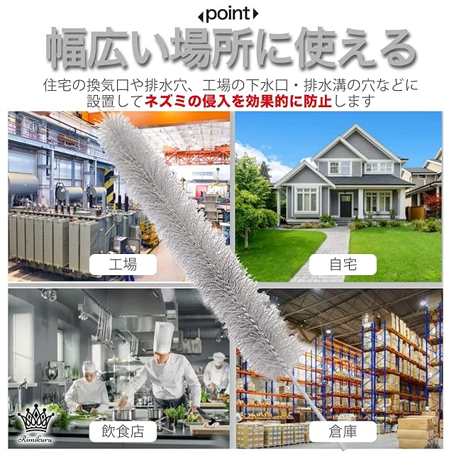 幅広い場所に使える:工場や倉庫、ご自宅、飲食店など様々な場所で使用できるネズミ侵入防止ブラシです。機械や装置等の隙間や住宅の換気口や排水穴、工場の下水口・排水溝の穴などに設置してネズミの侵入を効果的に防止します。