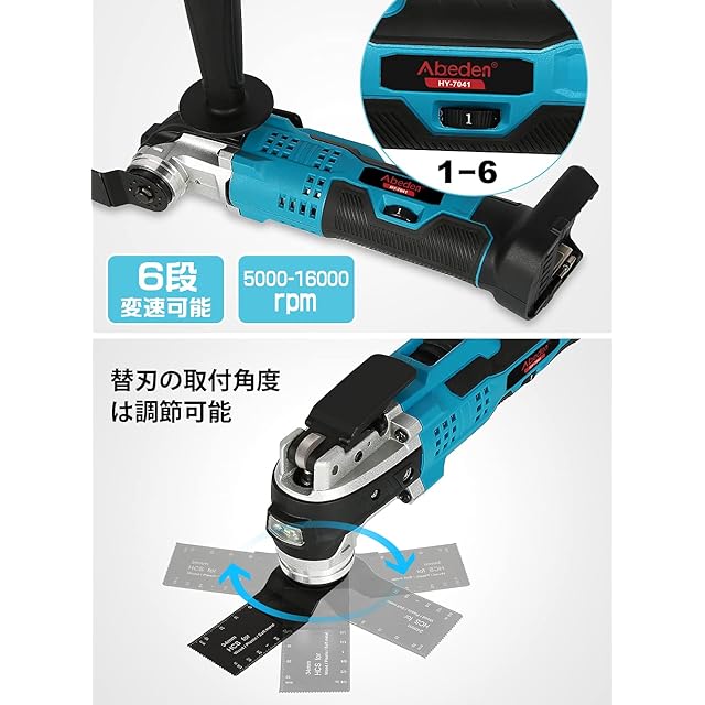 【商品仕様】■型番:マルチツール HY-7041 ■マキタ 18V バッテリー用 ■サイズ:(バッテリー抜き)約28×6.5×9cm ■本機重量:1.1kg ■振動角度:3度 ■最大回転数:5000-16000rpm ■ダイヤル6段階変速