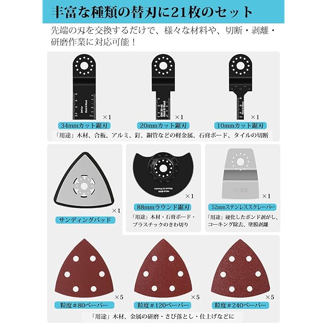 【梱包内容】マルチツール本体*1、補佐ハンドル*1、21枚替刃セット*1、日本語取説*1。※組み立て簡単で、どうぞ取扱説明書をよくお読みの上、製品を安全にお使いください。