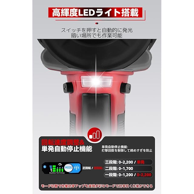 【3速度切り替え可能&単発自動停止】 電動インパクトレンチの速度は調節可能です。 正回転速度は3段階調整が可能、逆回転速度は2段階調整が可能です。逆回転の2段階は単発停止機能であり、ナットが回転しすぎないようにすることができます。 用途に応じて、インパクトレンチの段階を調整することができ、電力を節約して長時間使用するのに役立ちます。