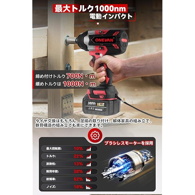 ONEVAN インパクトレンチ 18v 充電式 電動インパクトレンチ 18vマキタ 互換可能 緩めトルク700N・m 締め付けトルク630N・m 正逆転両用 4速切り替え LEDライト付き 無段変速 18vインパクト 電動インパクト 電動レンチ タイヤ交換 (赤い, 1000NM+バッテリー*2)