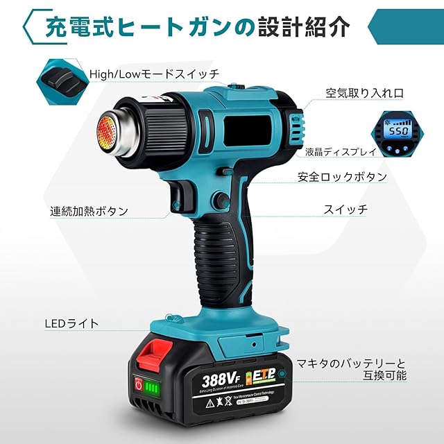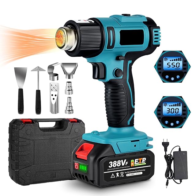 【高速加熱&液晶ディスプレイ】ヒートガンは高品質モーターを採用しており、高速加熱と優れた耐久性の特性を持っています。 スイッチを押すとヒートガンから素早く熱風が噴出し、作業効率が向上されました。 液晶ディスプレイは風量と温度を微妙に調整でき、さまざまなシーンに応じて温度と風量を調整できるため、バッテリー電力を節約し、ヒートガンの使用時間を延長できます。