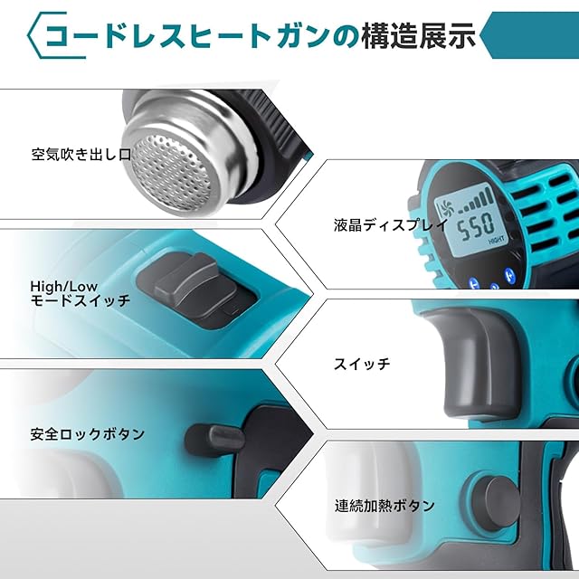 ONEVAN ヒートガン コードレス 18v マキタのバッテリー交換可能 6段風量調整 50~550℃調整 充電式ヒートガン ノズル七個付き 小型 熱風機 急速加温 充電式 軟化 加工 熱処理 DIY作業 PVCとレジンの収縮 塗料の剥離など適用 バッテリー付き