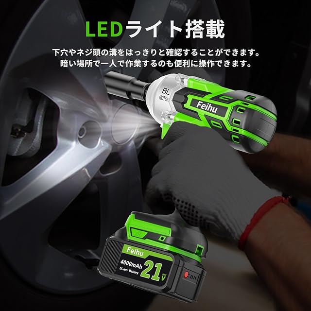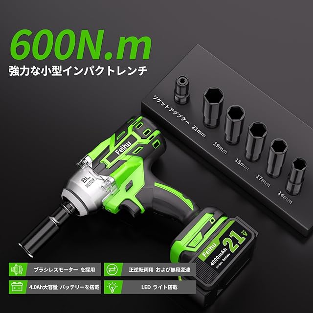 インパクトレンチ 電動 インパクトドライバー タイヤ交換 充電式 強力600N・m ブラシレスモータ搭載 コードレ インパクトレンチ ドリルドライバー 小型 21V 4000mAh バッテリー 無断変速 LEDライト PSE認証済み