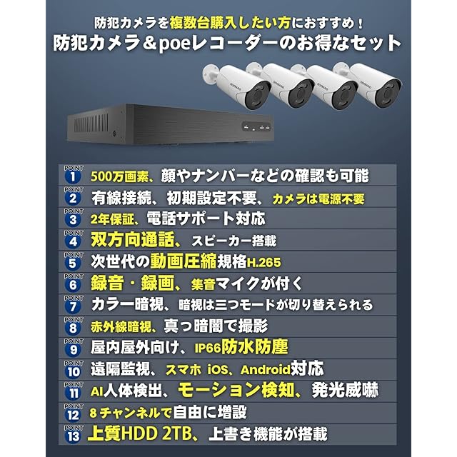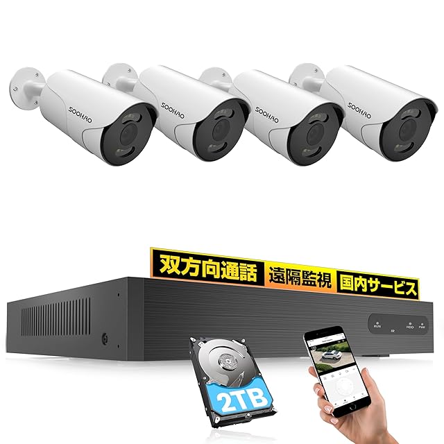 【500万画素・AI人体検出・カラー暗視】SOOHAO 防犯カメラ poe給電 監視カメラ 防犯カメラセット 有線 1920P 双方向音声 H.265 録音 録画 IP66防水防塵 遠隔監視 屋内 屋外 8台まで増設可 (poeカメラ4台+録画機+2TB HDD)