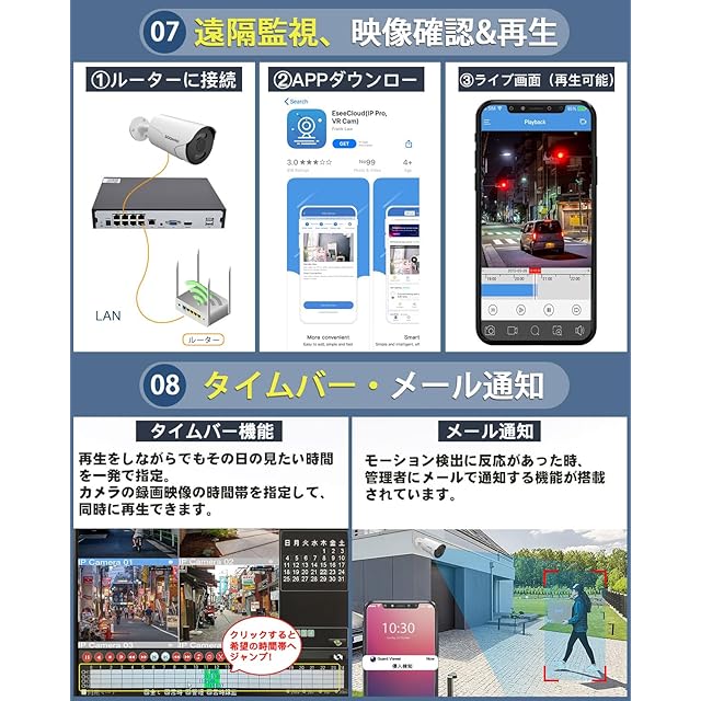 「録音・録画・Alexa対応・遠隔監視」防犯カメラ本体は集音マイクが付いていて映像と同時に5~7M以内の声や音も記録でき、レコーダー本体にはスピーカーを搭載。 リアル音声等、再生時に音声を確認可能です。また、スマートフォン用のiOSおよびAndroid対応アプリにアクセスすることで、友人や従業員とビデオを共有することができます。PC側専用ソフトも提供。