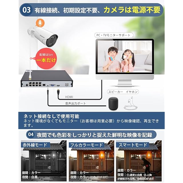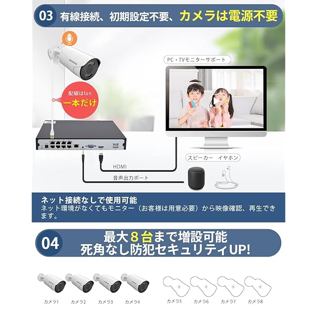 「初期設定不要・取り付けが簡単・増設自由」SOOHAO 500万画素防犯カメラは、すべて有効画素数500万になります。出荷前にペアリングが完了しており、カメラを接続するだけで映像が表示され、録画が開始されます。お手持ちのモニターを接続するだけで、すぐに映像を確認できます。インターネット環境がなくても、モニターから直接映像を確認可能です。最大8台までカメラを自由に追加。家庭/店舗/倉庫/玄関/ガレージ用など、さまざまな防犯カメラシステムに最適。POE給電タイプなので、外電源(コンセント)がない場所でも設置可能、工事費用が抑えられます。