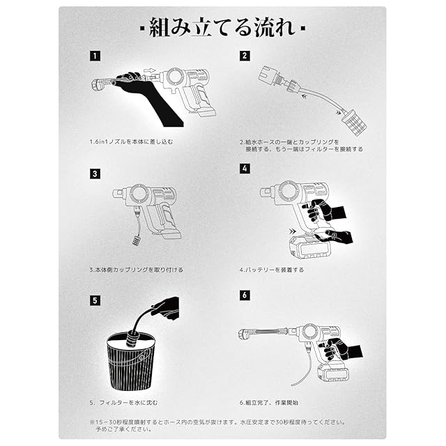【安心保証&豊富な付属品】パッケージには、高圧洗浄機本体、収納ボックス、カップリング、バッテリー、ペットボトルコネクター、充電器、フィルター、フォームランス、5m給水ホース、多機能ノズルのほか、日本語のわかりやすい説明書も同梱されます。
