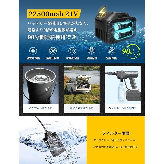 【大容量20000mAhバッテリー】22500mahの大容量バッテリー(pse認証済み)を配備しており、最大90分間連続使用可能、1回の充電で2〜3台の車を洗車することができます。バッテリーシステムには過充電保護、過放電保護、過電流保護、短絡保護などの複数の保護機構が備わっており、安心してご使用いただけます。