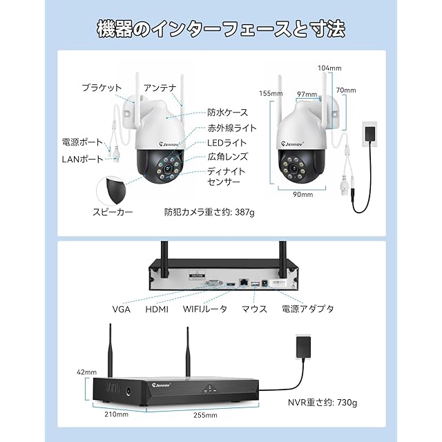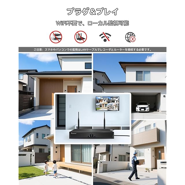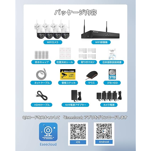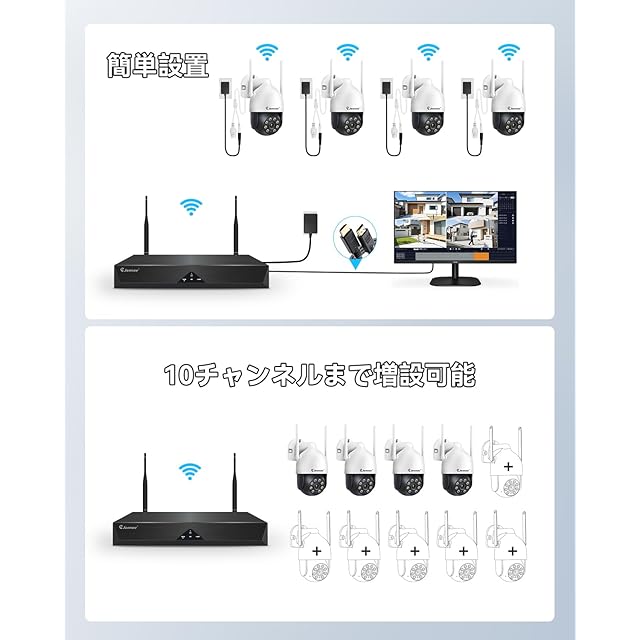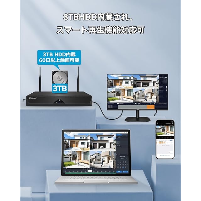 ♪【3TBHDD内蔵●H265+圧縮規格●増設可能】★年寄りでも簡単に設定可能です。複雑な配線工事は不要。ワイヤレス防犯カメラなので 、映像が無線で繋がり電源だけ確保すれば良い比較的設置し易いです。Jennov屋外監視カメラは従来のH.265の約2倍の圧縮性能を有する次世代のH265+動画圧縮規格を採用し、超高解像度映像でも既存の周辺機器のまま安定した運用が可能になります。また同時に処理速度も50%アップし、インターネット回線速度の遅い場所でもよりスムーズに視聴が可能です。3TBHDDが内蔵され、3MP·録音カメラ4台で約60日間(約1440時間)映像の記録が可能です!また、本商品は4台300万画素のワイヤレス防犯カメラセットですが、8チャンネルに対応の録画機なので、家庭内で様々な用途・設置場所に用いることが出来るよう、さらにカメラを1~4台増設可能です。録画機の購入が不要です。小型なので住宅、玄関、駐車場、農園、果樹園、ゴミ捨て場の不法投棄監視に最適です。(増設専用カメラ:B09TBCXTNB、B0F2SZ61J9、B096Z96LXF、B0D5Y733TS、B0BLCJRNHQ )
