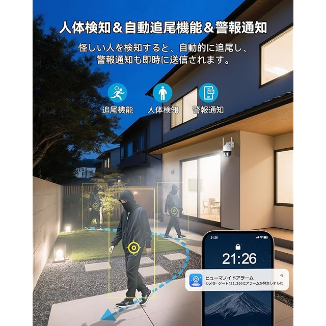 ♪【AI人体検知●自動追尾機能付き●360°広角撮影】AI人体検知機能が付き屋外防犯カメラが登場。人体のみが検出されるため、誤警報率を効果的に低減し、不要な迷惑を避けます。不審者を検知すると、自動的に追尾し、カメラ側から警報音を出して犯人を威嚇したり、夜になるとライト警報を鳴らすながら不審者を警告したり、撮影を続けます。盗難被害の拡大を防止可能となります。パン/チルト機能が搭載し、水平に0~355°、垂直に 0~90°範囲に角度調整可能です。今までの固定式のカメラと違い、電動の上下左右回転機能が付き、360度撮影可能です。スマホのアプリまたはマウスで遠隔地から簡単にレンズ向きをコントロールすることができます。コスパだけではなく、多機能で利便性のよさも抜群になりました。(ご注意:POE給電のタイプではありません。)