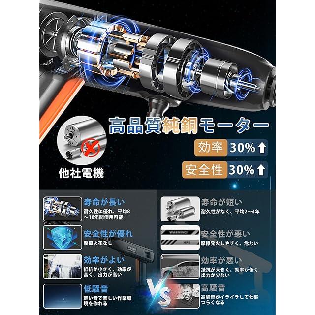 【最新強力モーター&高圧洗浄機】新しくレベルアップした高性能の純銅モーターは、極高い安定性・耐久性と強力な出力効率。過電流保護・過電圧保護・過充電保護・過放電保護の機能があり、より安全にご利用いただけます。オプションパーツは豊富で、自吸機能つきで汎用性が高く、小型のため持ち運びやすく、射を切り替える6in1ノズルや、フォームノズルが付き、高圧ホースは接続しやすく、ノズルの先端を回転させることで6種類の水流を使い分けられる点は様々なシーンで大活躍!洗車や庭、屋外、階段、網戸・窓ガラス、ブロック塀、外壁、駐車場、玄関まわり、自転車・バイク、ベランダ、高い場所、家まわり、浴室、年末大掃除、キャンプ用品の清掃やBBQの片付けにも大活躍。頑固な汚れをキレイに洗浄可能です。