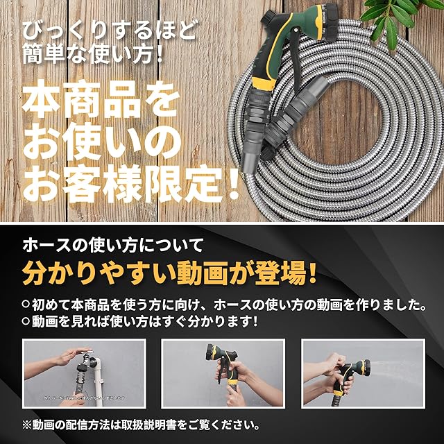 【らくらく使える】このガーデンホースはUV耐性が施されているので、炎天下の中でも熱くなりにくいです。ホースの表面はステンレス鋼(SUS304)が使われていて錆びにくい作りです。まさに真夏の中でお宅の水やりにらくらく使える一品です。