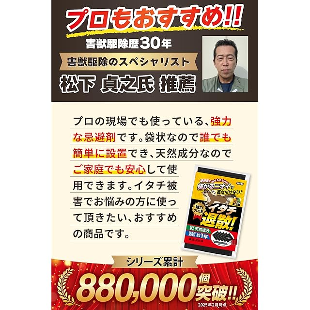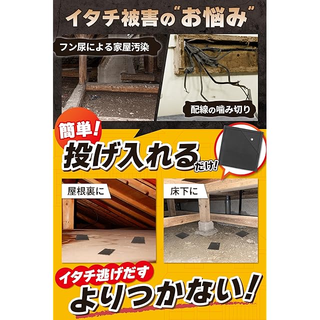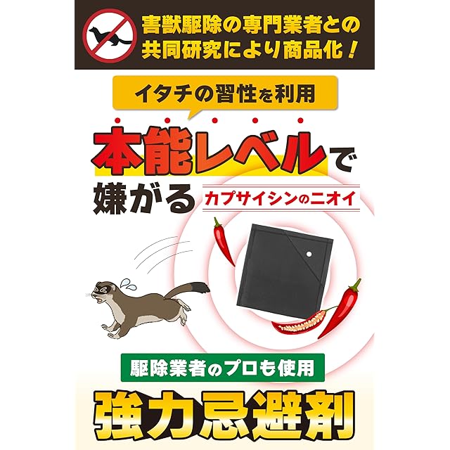 【害獣駆除のプロ推薦・シリーズ累計88,000個突破!】本能レベルで嫌う「カプサイシンのニオイ」でイタチを撤退。優れた嗅覚を持つイタチには耐えられない強烈な刺激。イタチの習性を利用してその場所への執着を断ち切る目的で害虫獣駆除の専門業者との共同研究から開発された忌避剤です。お陰様でシリーズ累計88,000個突破!致しました。ご愛用頂き誠にありがとうございます。