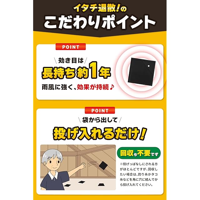 【ご注文前にお読みください】この商品はイタチ対策に効果的ですが、自然の生き物を対象とするため、全ての状況で効果があるとは限りません。以下の点にご留意いただき、ご納得の上、ご注文をお願いいたします①使用環境:強風の環境下ではニオイ成分が拡散し、通常の効果が発揮しにくくなります。②周囲の状況:近くにイタチが特に好む場所(エサ場など)がある場合、忌避が困難なことがあります。また、妊娠中や空腹時には忌避剤を無視して、お気に入りの場所へ留まる可能性が高まります。③個体差による違い:同じ種類のイタチも感受性や行動パターンが異なり、特に若く健康なイタチは抵抗力が高いことがあります。【重要 】イタチの通り道を事前に予測し、通り道を”通せんぼ”するように設置します。設置する際は間隔を狭め、数を増やすことで、より高い効果が期待できます。なお、この商品は非農耕地用です。植物に直接触れないように設置してください。直接触れると植物が枯れる可能性があります。家庭菜園などで使用する際は、植物の周囲に設置し、直接的な影響を避けるようにしてください。