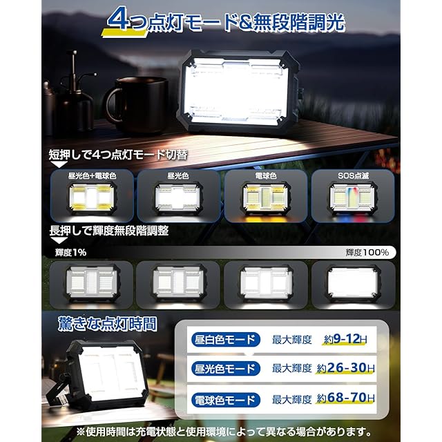 【4つの点灯モード&無段階調光】本LED充電式作業灯は4つの点灯モード(昼白色・昼光色・電球色・SOS点滅)を搭載。輝度も無段階調整可能で、必要な明るさを自由に設定できます。SOS点滅モードは緊急時に役立ち、幅広いシーンで活躍します。