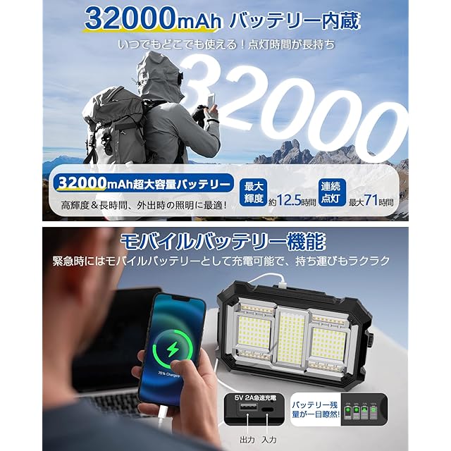 【32,000mAh大容量電池・モバイルバッテリー機能】当社の充電式投光器は32,000mAhの超大容量バッテリーを搭載し、長時間の使用を可能に。さらに、LED投光器はモバイルバッテリー機能も備え、緊急時の充電にも対応。バッテリー残量が一目で確認できるため、切れ際の心配もありません。アウトドア使用に最適で、幅広いシーンで活用でき、防災用品として家に備えておくのも安心です。