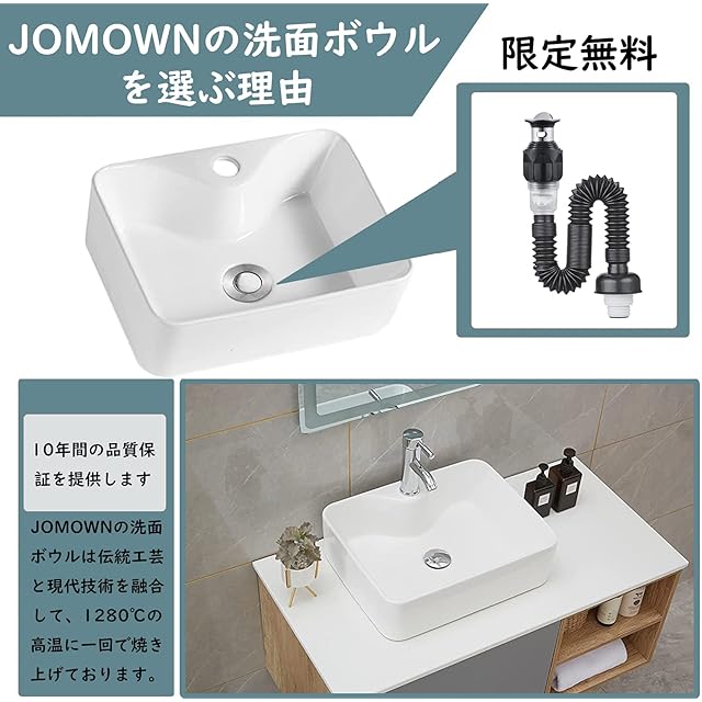 【JOMOWN限定排水セット付き】おしゃれ 洗面ボウル セット 洗面台 洗面ボール 置き型 手洗い鉢 陶器製 手洗い器 トイレ 手洗いボウル 410*310*130mm(長方形)