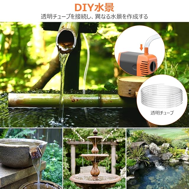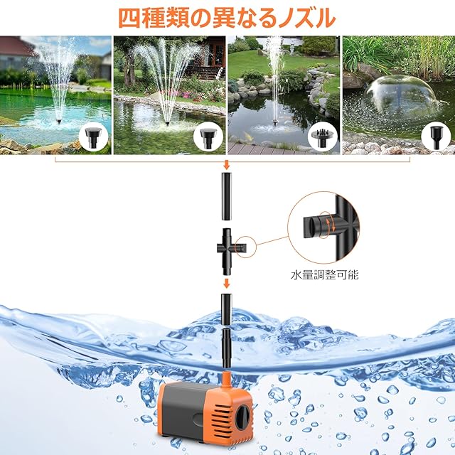 【四種類の噴水式】弊社のソーラー 噴水ポンプは四種類の噴水式があり、ノズルを交換することで噴水式と高さを調整し、約1.8メートル透明チュープ付けて、異なる水景を作成できます。