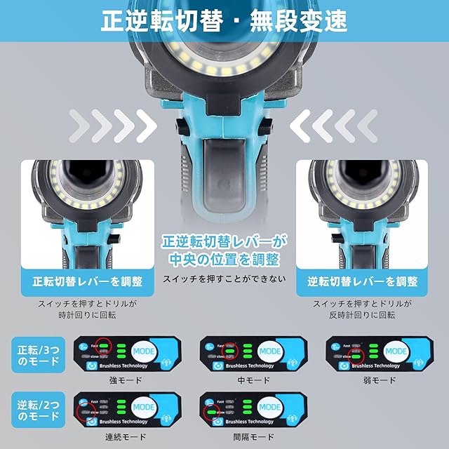 【3速度切り替え可能&単発自動停止】 電動インパクトレンチの速度は調節可能です。正回転速度は3段階調整が可能、逆回転速度は2段階調整が可能です。逆回転には連続回転モードと単発停止モードの 2 種類があり(操作パネルのインジケーターランプで区別可能)、これによりナットの過回転を防止します。 用途に応じて、インパクトレンチの段階を調整することができ、電力を節約して長時間使用するのに役立ちます。