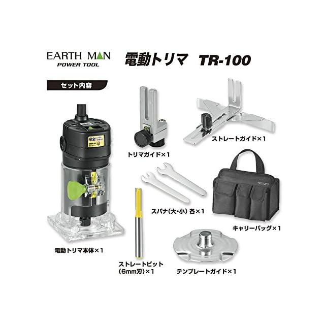 セット内容:電動トリマ本体×1、トリマガイド×1、ストレートガイド×1、テンプレートガイド×1、スパナ(大・小)×1、ストレートビット(6mm刃)×1、キャリーバッグ×1