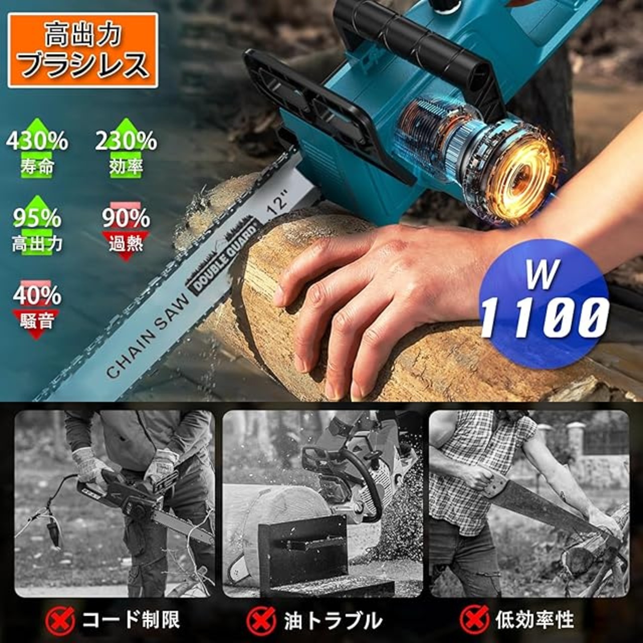 【 高品質ブラシレスモーター 】コードレス充電式のチェーンソーで、1100w の高出力を備えています。充電式チェーンソーは430%長寿命のブラシレスモーターを搭載。ブラシ式に比べ出力95%向上、消費電力90%削減。火花発生なし、低騒音・低振動で安定動作。交換メンテナンス不要なため、強力かつ効率的な切断を長期にわたって持続します。ご注意:本機は過熱保護機能が付いています。30 分連続使用後は、一旦使用を停止して、モーターが過熱することによる故障を防止してください。