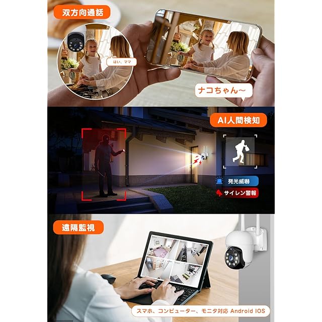 【遠隔監視●AI人検知+人感発光●双方向通話可能】❶防犯システムをインターネットに接続すると、専用のアプリをダウンロードして、遠隔地のスマホやタブレット、PCから監視や遠隔操作可能です!❷また最新スマートAI人検知機能が実現、撮影範囲内で不審な動きがあった際には、防犯灯が明るく発光(夜間だけ)します。インテリジェント警報が即時アプリとメール(写真付き)を送信します。外出でもスマートフォンからライブの画面を監視して、盗賊を防止可能です。 ❸ワイヤレス監視カメラは高感度集音マイクと上質スピーカーが内蔵され、録音だけでなくインターフォーンのように通話できます。現場の音声を正確に認識して360°集音し、録音音声の綺麗さや鮮明さを実現します。10m録音範囲内のご家族と交流し、不審者に直接話しかけて、ペットカメラ、見守りカメラ、ベビーモニターや防犯カメラとして多目的で使えます。人の行き来が多い場所、逆に死角になっている場所、夜間に薄暗くなりがちな場所や貴重品が置いてある場所など、防犯カメラの設置に適します。