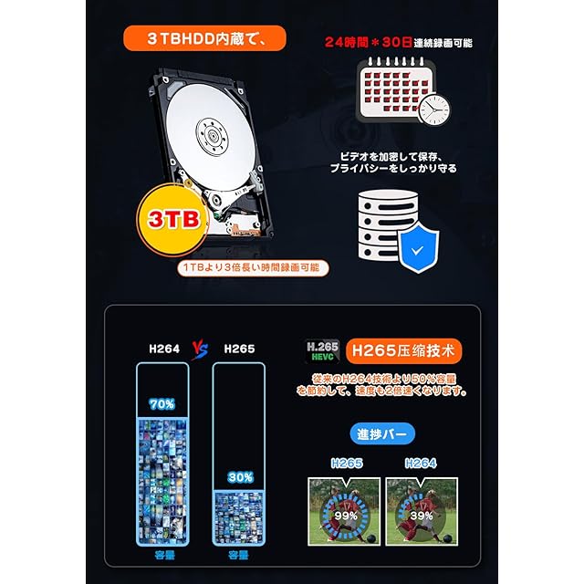 【3TB大容量HDD&H.265+高圧縮技術&多様な録画モード】ワイヤレス監視セット NVRに上品質な3TBHDDが搭載し、最新圧縮方式H.265対応、ストレージ容量を節約しますから、1-4台監視カメラを増設しても20日以上録画可能です。また、HDDの残量がなくなる場合、システムは自動的に最も古い録画データを上書きして最新に生成されたデータを保存し、手動による削除は不要!1年365日にループ録画できます。防犯監視システムは三つの録画モードを設定できます:①常時録画:終日24時間録画。②動体検知録画:監視エリアで動きを検知した時だけ録画を開始します。③スケジュール録画:指定された時間帯に録画します。お好みに合わせて自由に録画モードを調整できます。