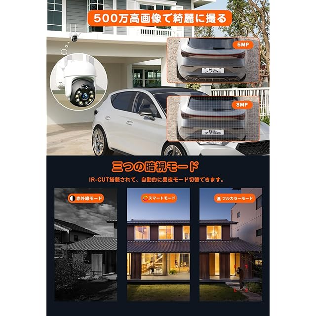 【500万画素超高画質&夜間カラー映像】2560*1920P超高解像度のハイビジョンワイヤレス防犯カメラです。以前のカメラで表現できなかった高画質を実現し、被写体を鮮明に撮影可能です。かなり細部まで撮影、記録できます。画像を8倍に拡大した場合でも映像での確認が容易になり、万が一の事件やトラブルが起きた際も証拠として初期解決に繋がります。赤外線ライト付き、暗視距離約20m以内で、夜間でもはっきり監視できます。先端的なセンサー技術で、自動的に昼夜モード切替できて、24時間でも鮮明なカラー映像できますから、1日まるごとお家を見守ります。家庭用から店舗やビル・オフィスにもご使用いただける防犯カメラです。
