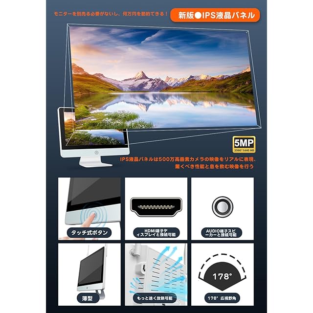 【PTZカメラ&新版IPS式防犯モニター】❶パンチルト機能が搭載し、スマホアプリから監視角度(上下0~90°左右0~355°)を自由に調節でき、死角なしで監視領域を見渡せるワイヤレス防犯カメラが登場!❷ドーム型なので屋外・屋内の天井や壁面も設置できます。天井に取り付けたら部屋全体を水平方向355°、垂直方向90°のパン/チルトPTZ機能で360度の全方位監視ができます。視野角を上下左右に映せるため、4台セットは従来の防犯カメラの数台分の防犯が可能になり、死角のない映像を録画できます。❸防犯モニターは液晶モニターと録画機が一体になっているので、別途にモニターを用意する必要がありません。一体型PCと類似のデザインので、オシャレで立派ですし。更に筐体がコンパクトで直感的に、持ち運びしやすいです。また、HDMI端子付き、HDMIケーブルを使用してご自宅のテレビ(1080P以上の場合)に接続して、もっと大画面で動画を楽しめます。