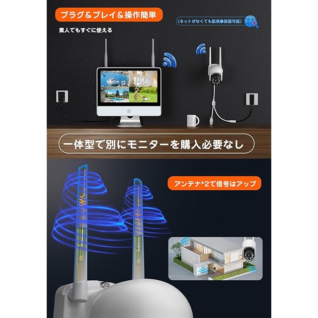 【双アンテナで信号UP!&簡単接続●工事不要】防犯カメラは最新強化版WiFiアンテナ*2を採用して、従来の単アンテナより、信号は何倍増強します。従って、距離が遠くても、信号を安定に接続し、頻繁に連絡が中断することを避けます。電源を入れるだけで録画が開始、初期設定不要。出荷前に稼働試験実施しており、初期のセットアップが完了しております。届いてすぐに映像確認、録画開始。ネット環境なくても録画機でライブ視聴、再生、設定できます。遠隔監視するときにネット環境が必要です。初心者にも優しい防犯カメラセットです。小型なので住宅、玄関、駐車場、農園、果樹園、ゴミ捨て場の不法投棄監視に最適です。