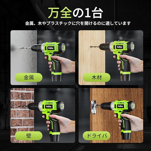 【電動ドライバースピード調節機能】 2つの可変速度があり、幅広い穴開けに適合します。トリガースイッチを押す力により無段変速が行え、回転速度も調整できます。 スピード調節とクラッチ機能で幅広い材質に傷をつけず、きれいな組み立てが仕上がります。DIY初心者から中級者におすすめのドライバドリル。ネジの締め・緩めもワンタッチ切り替え。