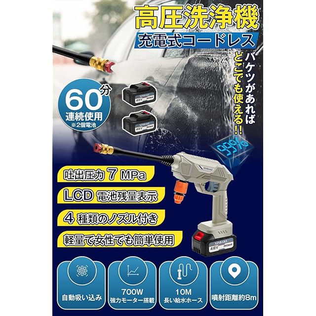 高圧洗浄機 コードレス 充電式 【強化アップグレード版 デジタル残量表示】 コードレス高圧洗浄機 洗車機 700W 家庭用 6-in-1ノズル 自吸式 10mホース バッテリー2個付き 約60分間連続使用時間 洗車機 強力噴射 軽量 ポータブル 水圧洗浄機 初心者向け 掃除用品 洗車 車掃除 庭 階段 外壁 ベランダ 収納ボックス 日本語説明書