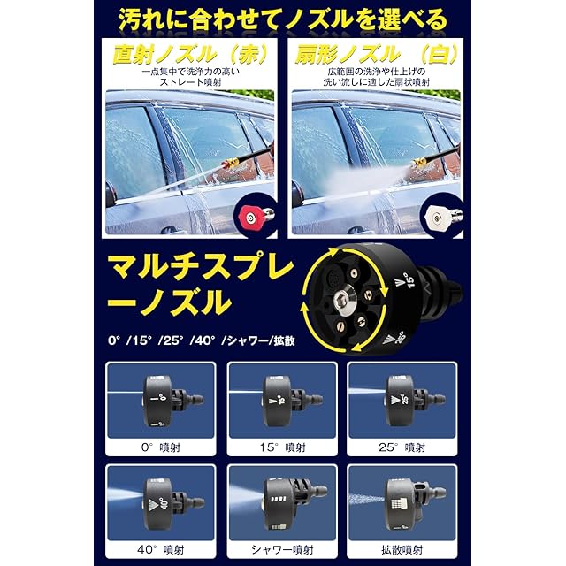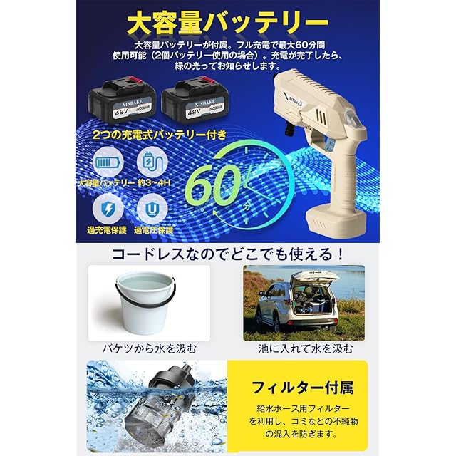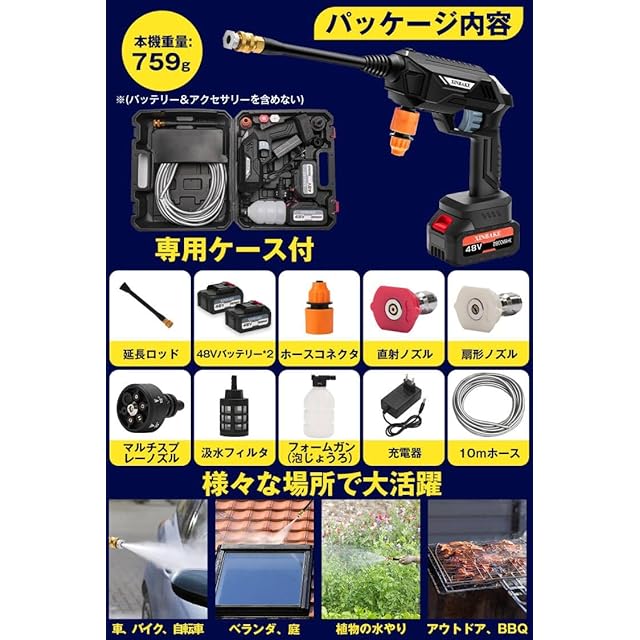 【豊富な付属品&安心保証】高圧洗浄機本体 x 1、48Vバッテリー x 2、充電器 x 1、6 in 1ノズル x 1、直射ノズル x 1、扇形ノズルx 1、延長ロッド x 1、フォームガンx 1、ホースコネクター x 1、10mホースx 1、汲水フィルタ x 1、収納ボックス x 1、日本語取扱説明書 x 1。【安心保証】 弊店は100%の高品質を追求し、ご購入より安心保証付き、何がご質問とご要望がありましたら、アマゾンの注文履歴にて、お気軽にご連絡お願い致します。※ご使用前に必ず説明書をお読みになり、内容を十分に理解した上で、正しくお使いください。万が一商品に初期不良・不具合等あった場合やご満足いただけなかった場合は、ぜひ当店にご連絡ください。