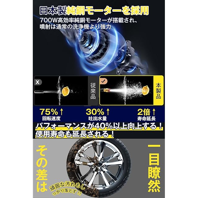 【コードレス式高圧洗浄機&水道がない場所でも使える&強力なパワー】この強化版高圧洗浄機は自吸機能付きでコードレス式だから水道と電源のない場所でも、バケツさえ用意すれば、いつでもどこでも洗浄可能。専用タンク不要で使用場所を選びません。軽量コンパクトで、収納場所に困らない。10m長いホースを搭載し、湖、川、やためておいた雨水などの水を使用する時にとても便利です。耐久性に優れた純銅モーターが搭載されており、吐出圧力7Mpaのパワフルな高圧噴射で、頑固な汚れも簡単にきれいに落ちます。噴射距離も驚きの8mまでに達ち、 高い木や車の低部など届かない所の洗浄が楽になります。※本製品はカーボンブラシモーターを採用しているため、トリガーを引くと製品内部で一瞬スパークが発生してから作動します。正常の挙動ですのでご安心ください。