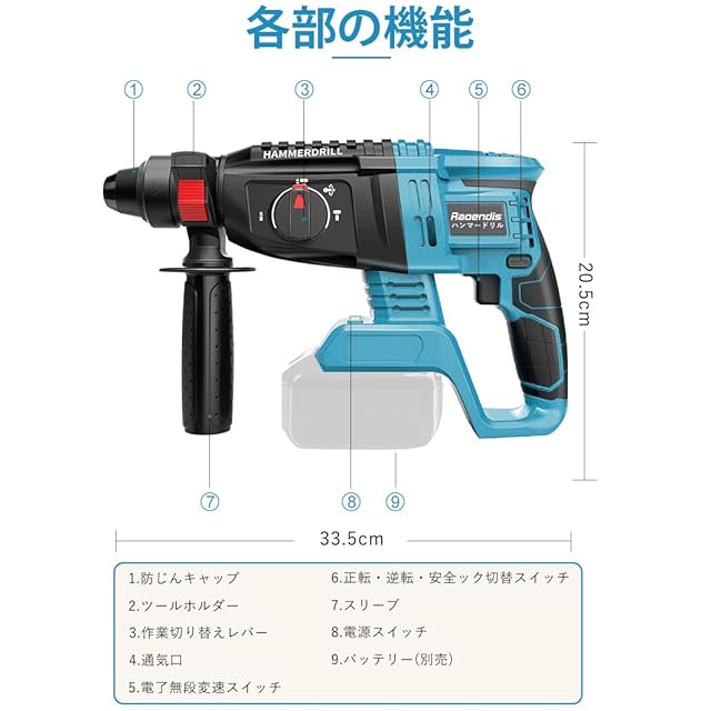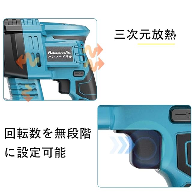 【パワフル、高耐久ブラシレスモーター】ブラシレスモーターはカーボンブラシを排除し、回転数:0~1400r/min、打撃数:0~4550回/minの強力なBLモーターをより低温でより効率的に運転することができます。 また、Raoendisの振動制御システムは、低レベルの振動と騒音を維持し、多くの競合他社よりも快適で静かな作業体験を提供します。最大穴あけ能力:コンクリート24mm、鉄工13mm、木工27mm。