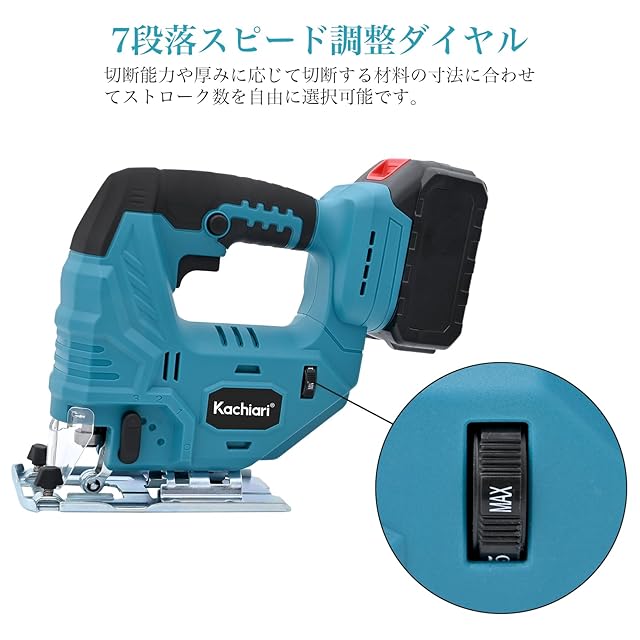 【スピード調整ダイヤル】ストローク数を自由に選択可能です。木材の切断能力や厚みに応じて適切な設定が選べるため、切断する材料の寸法に合わせてご使用ください。