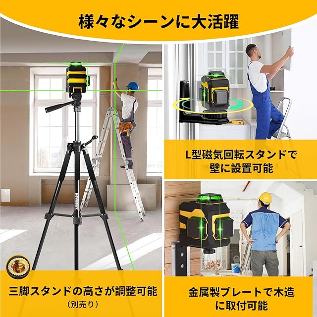 ✅✅【高精度&12ライン・3x360°実現】レーザー水平器(3x360°)は水平線が1本、垂直線が2本あり、12レザーラインで全方向に360度回転できるので、部屋全体をカバーし、レーザーの位置をあらゆる角度から確認することができます。精度も10mで±3mmなので十分です。ほどほどの精度で便利な墨出し器です。庭の塀の取り付け*畑の棚を設置する*ウォールシェルフを作る*レースウエイ*ラック工事*建築現場などにもとても便利です。
