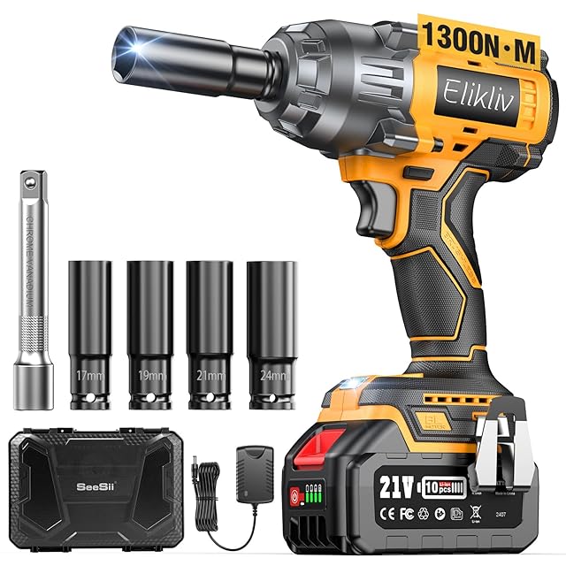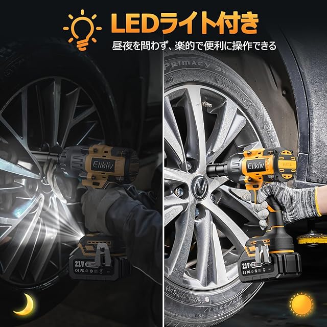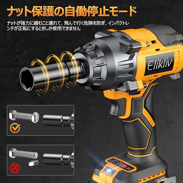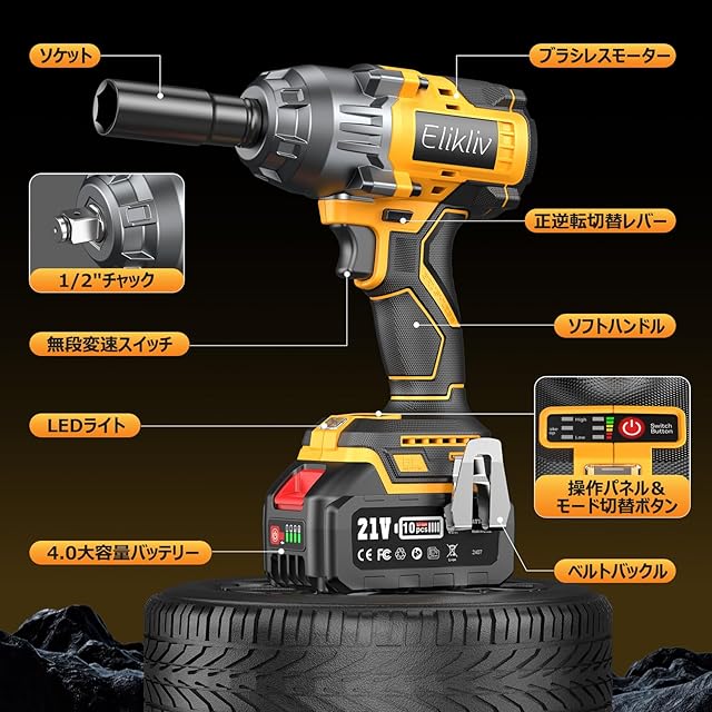 【2025年新登場】Elikliv 電動インパクトレンチ タイヤ交換 強力 1300N.m BLモーター採用 車用 タイヤ交換レンチ トルクレンチ 充電式 コードレス 無段変速・正逆転両用 自動停止モード LEDライト 4.0Ahバッテリー1個付き ナットの締め付け ボルトの緩み ホイール交換 日本語説明書付き