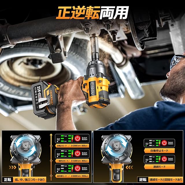 【無段変速と正逆回転機能搭載】当社のインパクトレンチは、0 から 6000rpm(min⁻¹)までの広い転速範囲で、無段変速機能を備えています。本体のトリガーを握る力の強さに応じて、無段階で回転数を自由に調整できます。作業内容に合わせて、回転速度を高、中、低の 3 段階に簡単に切り替えることができます。また、インパクトレンチ本体両側に設置された正逆転切り替えレバーを左右に押すことで、瞬時に回転方向を変更できます。ナットを緩める場合は正転に、締める場合は逆転に設定して、作業を行えます。自動停止モードは、ナットが強力に緩むときに、飛び出す危険を確実に防ぎます。このモードは、インパクトレンチが正転するときにのみ有効です。