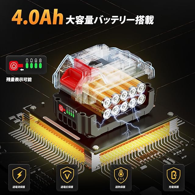 【4.0Ah 大容量バッテリー付属!LED 残量表示も完備】4.0Ah の大容量リチウムイオンバッテリーが付属しており、長時間の作業にも十分な電力を供給します。コードレスで充電式の設計なので、電源コードに縛られることなく、どんな場所でも自由に作業ができます。作業中に線に引っかかる心配もありません。さらに、バッテリーの残量や充電状態が一目で確認できる LED が搭載されており、いつでも電力状況を確認できます。また、この商品の本体はマキタの 18V リチウムイオンバッテリー BL1820b、BL1830b、BL1840b、BL1850b、BL1860b にも互換性があります。ただし、付属した充電器は付属したバッテリーのみを充電できます。