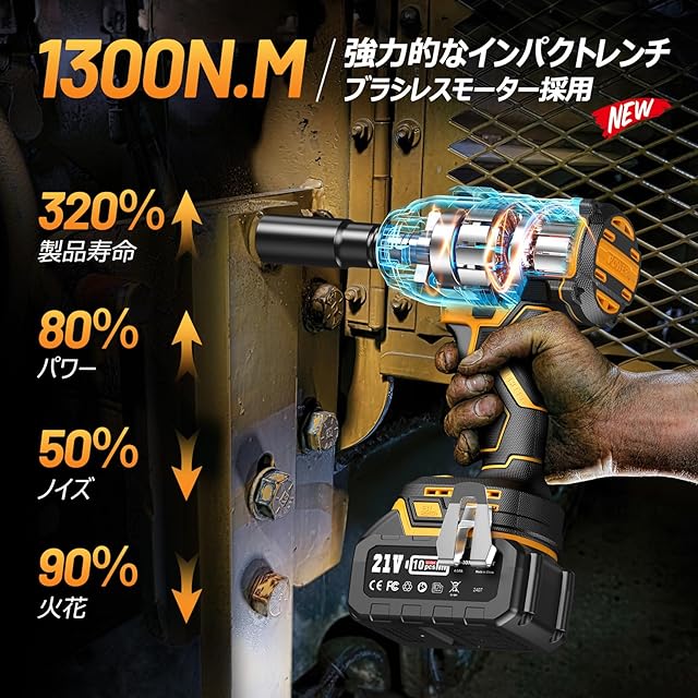【ブラシレスモーター搭載で長寿命・高パフォーマンス】❶ 寿命が 10 倍伸びる:当レンチに搭載されたブラシレスモーターは、通常のモーターを搭載したレンチと比べて、使用寿命が 10 倍に伸びます。60 分間の連続使用が可能で、モーターの総寿命は 30000 時間にも及びます。❷ 超強力な動力:ブラシレスモーターの力で、簡単にタイヤを取り外すことができます。強力な動力を発揮して、作業効率を大幅に向上させます。❸ メンテナンスフリー:カーボンブラシが不要なため、メンテナンスが一切不要です。使い続けても、定期的なメンテナンス作業が必要なく、安心してお使いいただけます。